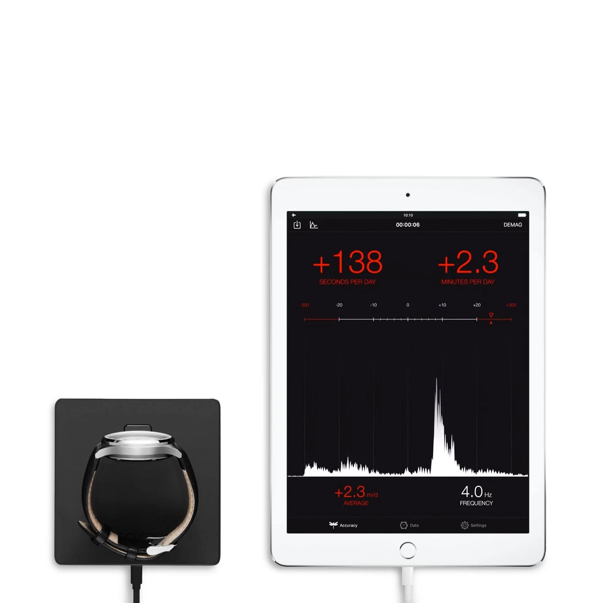 Since magnetic fields are everywhere in our connected world and can have an effect on your watch of up to several minutes of precision loss per day, the Boutique Edition of the Accuracy2 is also available. This incredible tool was designed in partnership with famous Swiss watch brands and combines all the features of the Accuracy2 with the ability to demagnetize your timepieces at home in less than 2 minutes. Just place your watch on the Accuracy2 Boutique Edition and push the “demag” button on the app — saving yourself the time and money a trip to the repair shop would otherwise require. Each device is entirely Swiss-made and arrives in sleek brushed aluminum housings.