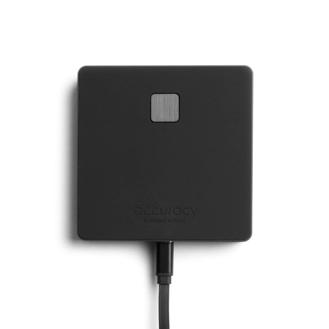 Accuracy2 Boutique Edition Dimensions: 95 x 95 x 20 mm / Weight: 200g / Connector: USB-type C / Apple Lighting Adapted Included / Apple iPhone or iPad Shown Not Included