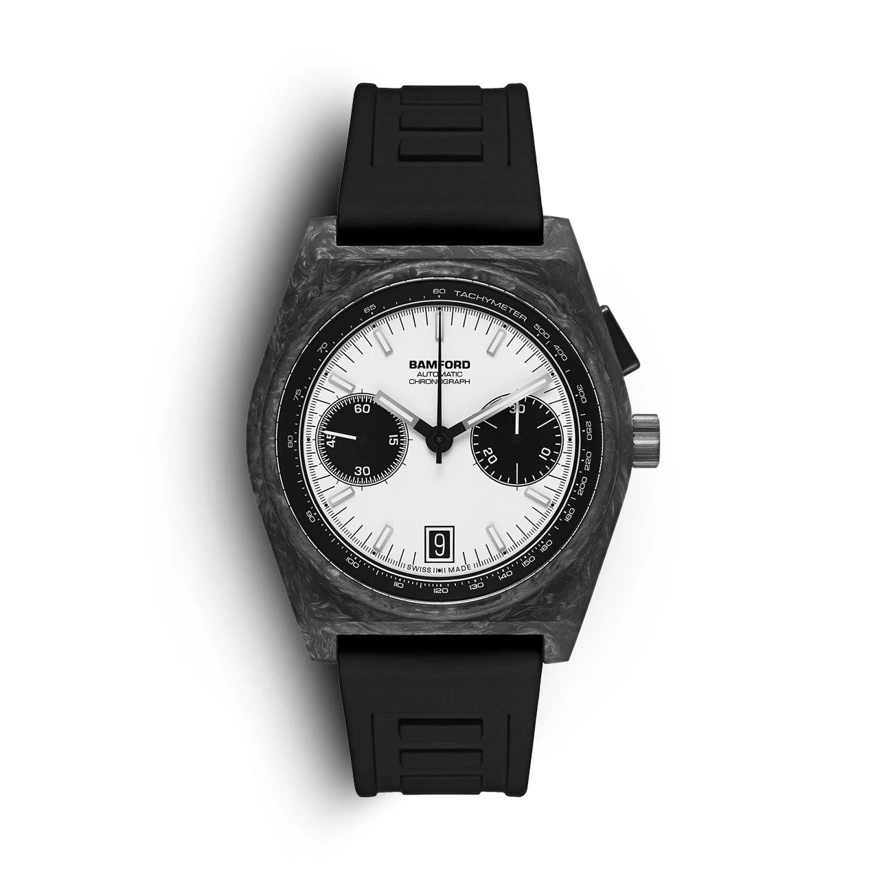 Combining bold styling with superior readability, Panda dials are among the most desirable chronometer references around. Bamford’s is no exception. Set within a 41.5mm black forged carbon case, its white dial has two black sub-dials, with small seconds on the left and a 30-minute counter on the right, as well as a date window at 6 o’clock. It’s powered by a Sellita SW510 automatic movement, with a single pusher at 2 o’clock. It’s finished with a black rubber strap and arrives in unique packaging.