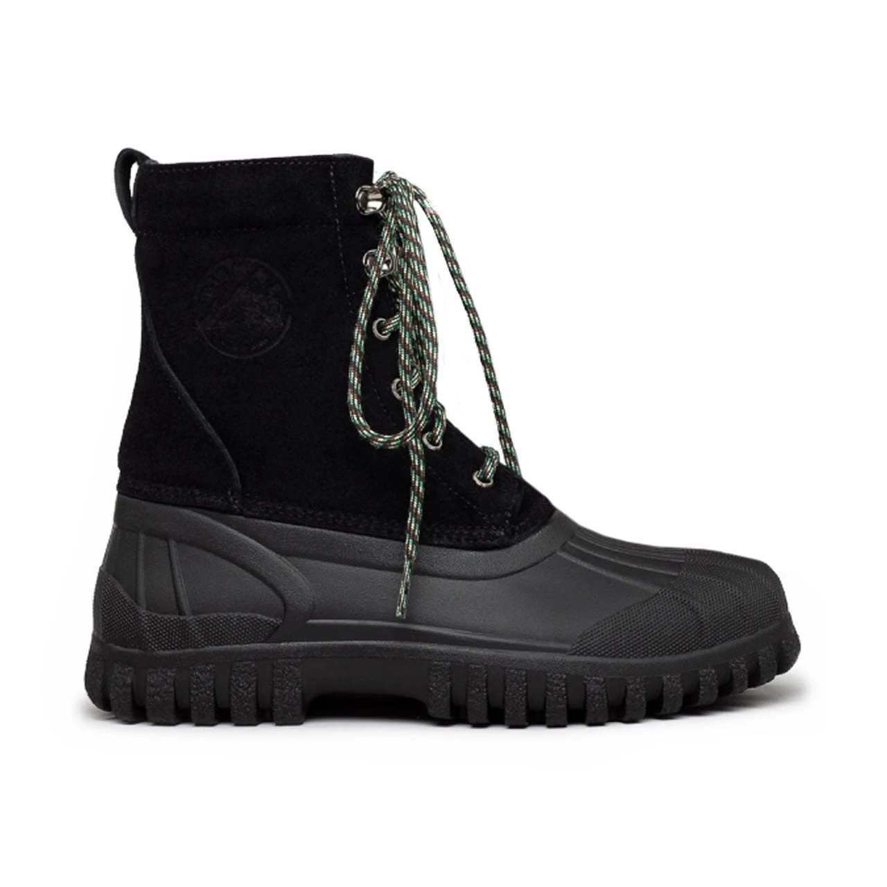 A modern interpretation of the duck boot, the Anatra recreates the classic with a fresh silhouette and quality materials. It slims down the profile with a fitted ankle crafted from black waxed suede leather. A tonal rubber duck sole made in Italy adds to the minimalist aesthetic, while a plush lamb shearling lining provides a warm interior. The boot is finished with contrasting green laces and an embossed logo.