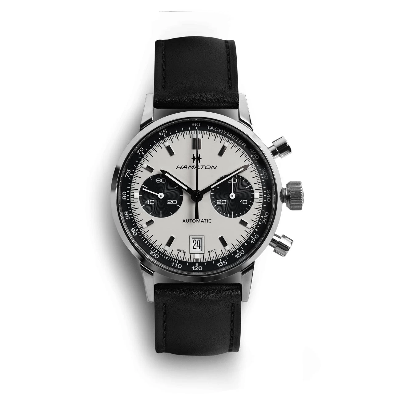 Inspired by vintage mechanical watches from the past, the Intra-Matic combines timeless style with modern upgrades. A distinctive panda-style dial grabs attention immediately, framed by a black tachymeter ring that matches both the textured black subdials at three and nine o’clock and the date window at six o’clock. Hamilton’s exclusive H-31 automatic movement is the heartbeat of the timepiece, complete with chronograph function, hacking seconds, and an enhanced mainspring to extend the power reserve to 60 hours. Sporty and classic, it’s all housed within a robust 40mm stainless steel case and finished with a black leather strap.