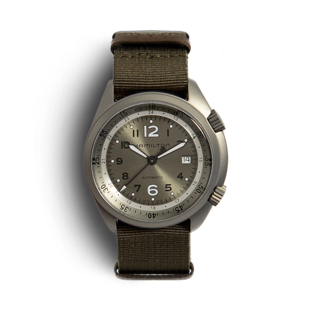 Aluminum is relatively strong and lightweight, which is why it’s often used in aviation. Hamilton pays homage to the material with its Pilot Pioneer Watch. Its 41mm case is made from green aluminum, giving it a decidedly military vibe. That’s continued by the Arabic numerals on the green dial, which are surrounded by a silver 24-hour ring, a reverse 60-minute outer ring, and augmented by a date window at 3 o’clock. The automatic movement offers a robust 80-hour power reserve, and the timepiece is finished off with a partially leather-coated NATO strap with an aluminum pin buckle.