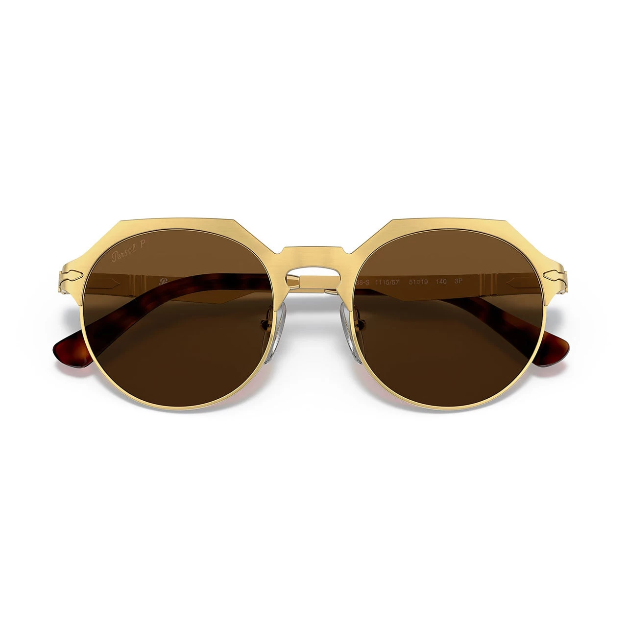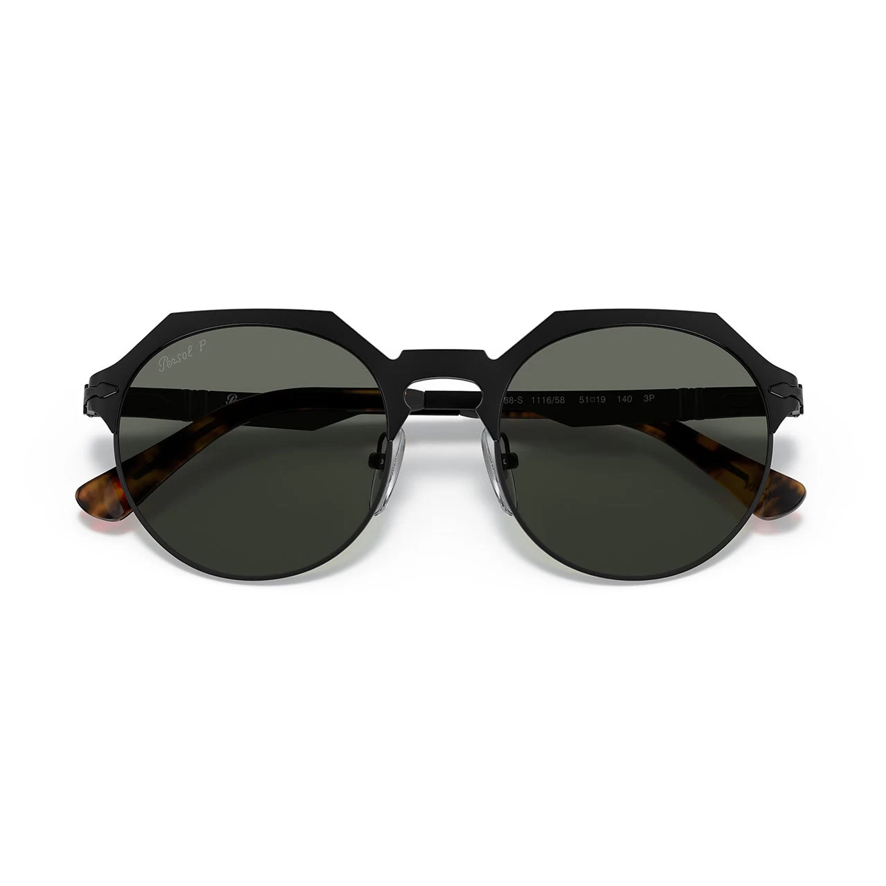 Persol is known for their acetate frames and vintage styling. Their 2488S silhouette uses metal elements and sharp angles for a more modern look. The metal frame has a thick top bar and bridge with thin, barely-there rims and subtle signature Arrows on the hinges. Polar green crystal lenses and tortoise temple tips give the otherwise black proceedings.