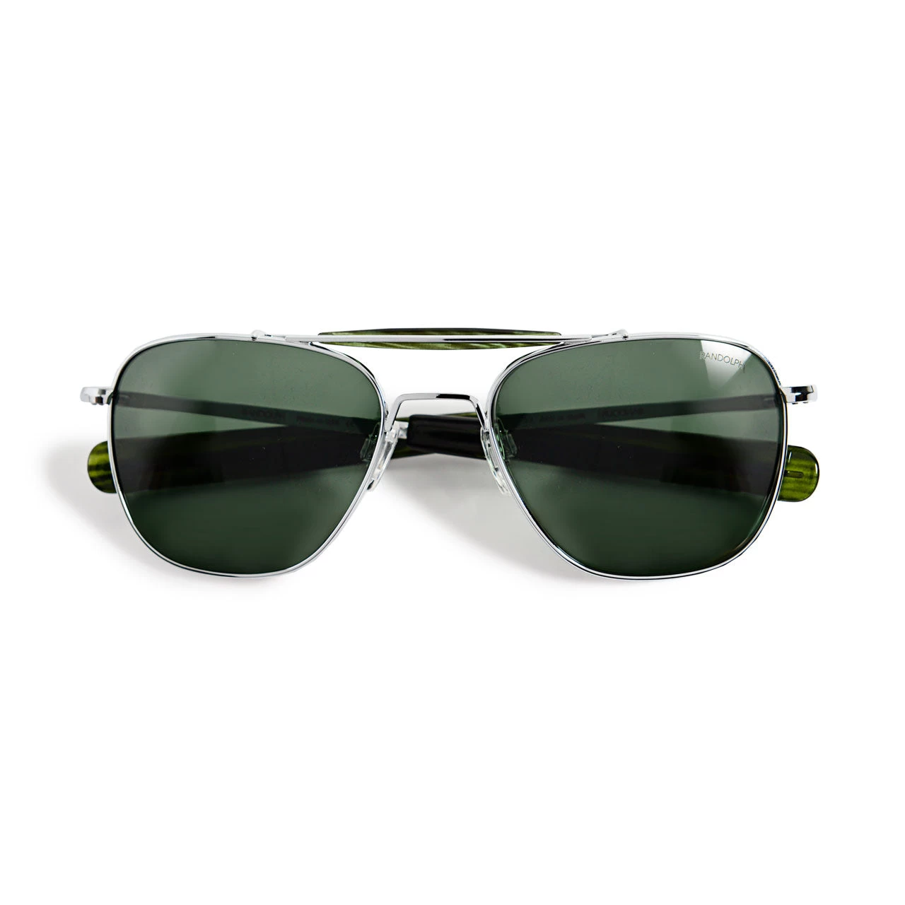 Randolph’s original Aviators were designed primarily for military use. Their Aviator II model is no different. Built to meet the highest military specifications, they retain many of the core features of the original, including bayonet temples that remain comfortable even under headgear and SkyTec polarized glass lenses with both Vector anti-reflective and Blue Wave lens technology. The lenses in this particular model are a relaxing AGX green that highlights soothing wavelengths of the light spectrum to reduce eye fatigue and are accented by a matching acetate sweat bar and jewelry-quality bright chrome frames. Guaranteed for life, they’re designed and handcrafted in the USA and arrive with an embossed hard case and microfiber pouch.