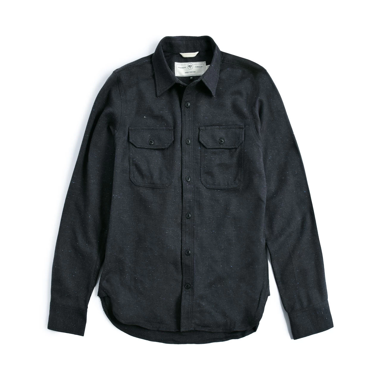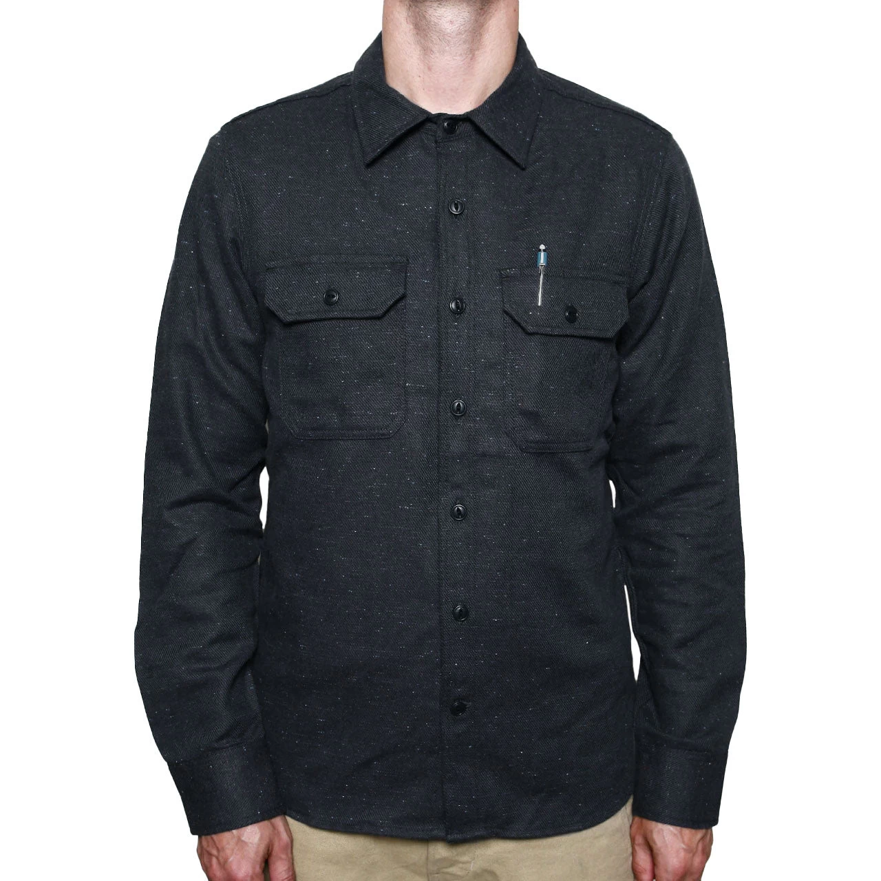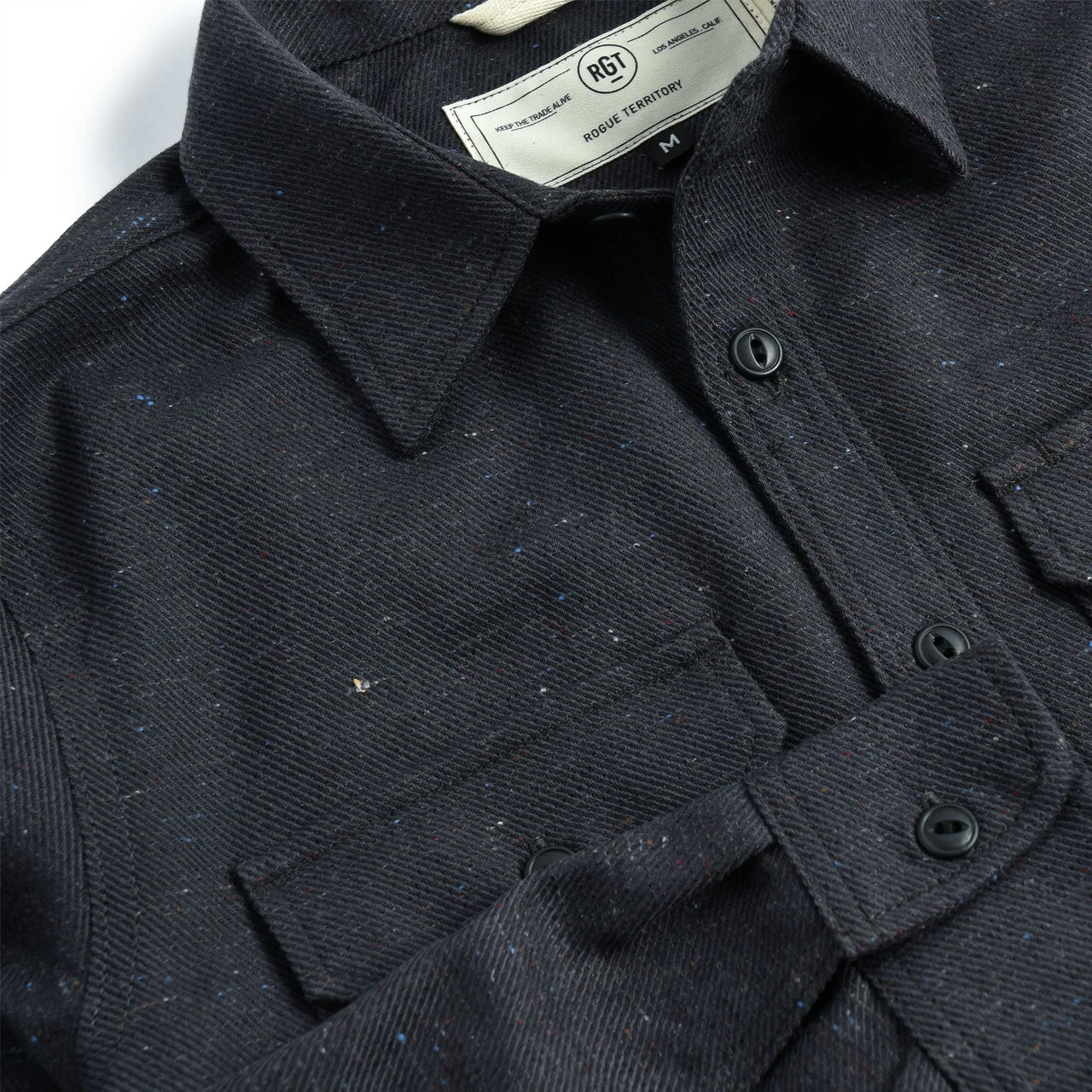 Workwear style meets elevated construction and materials in this Field Shirt from Rogue Territory. It’s made from a 6 oz, Japan-sourced cotton/acrylic blend in a dark grey with light specs. Details include triple-needle chainstitch seams with run-off at the end, two flap chest pockets with a pen slot, and Melamine buttons. The slim-fitting shirt also sports a natural herringbone locker loop and is stitched in Los Angeles, CA.