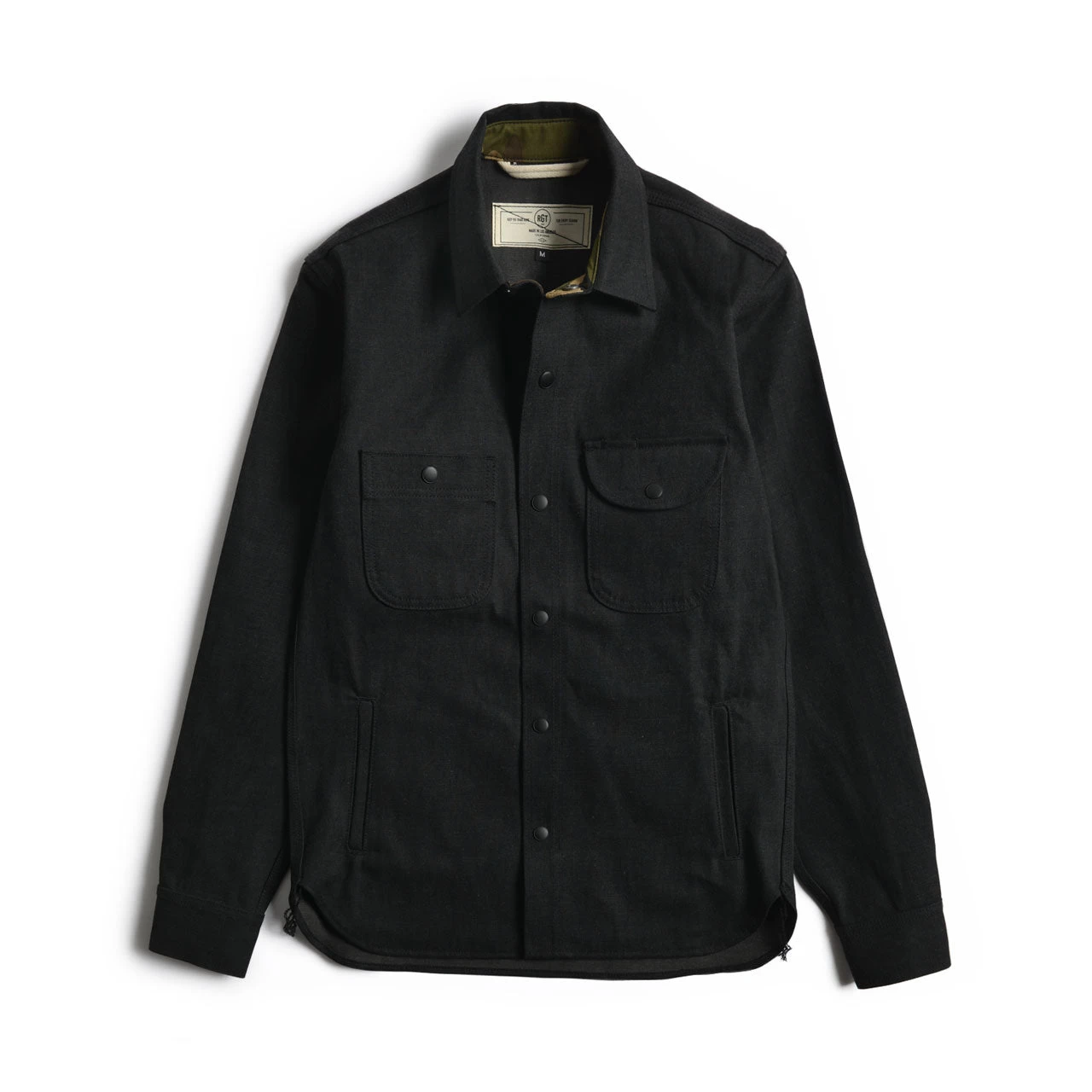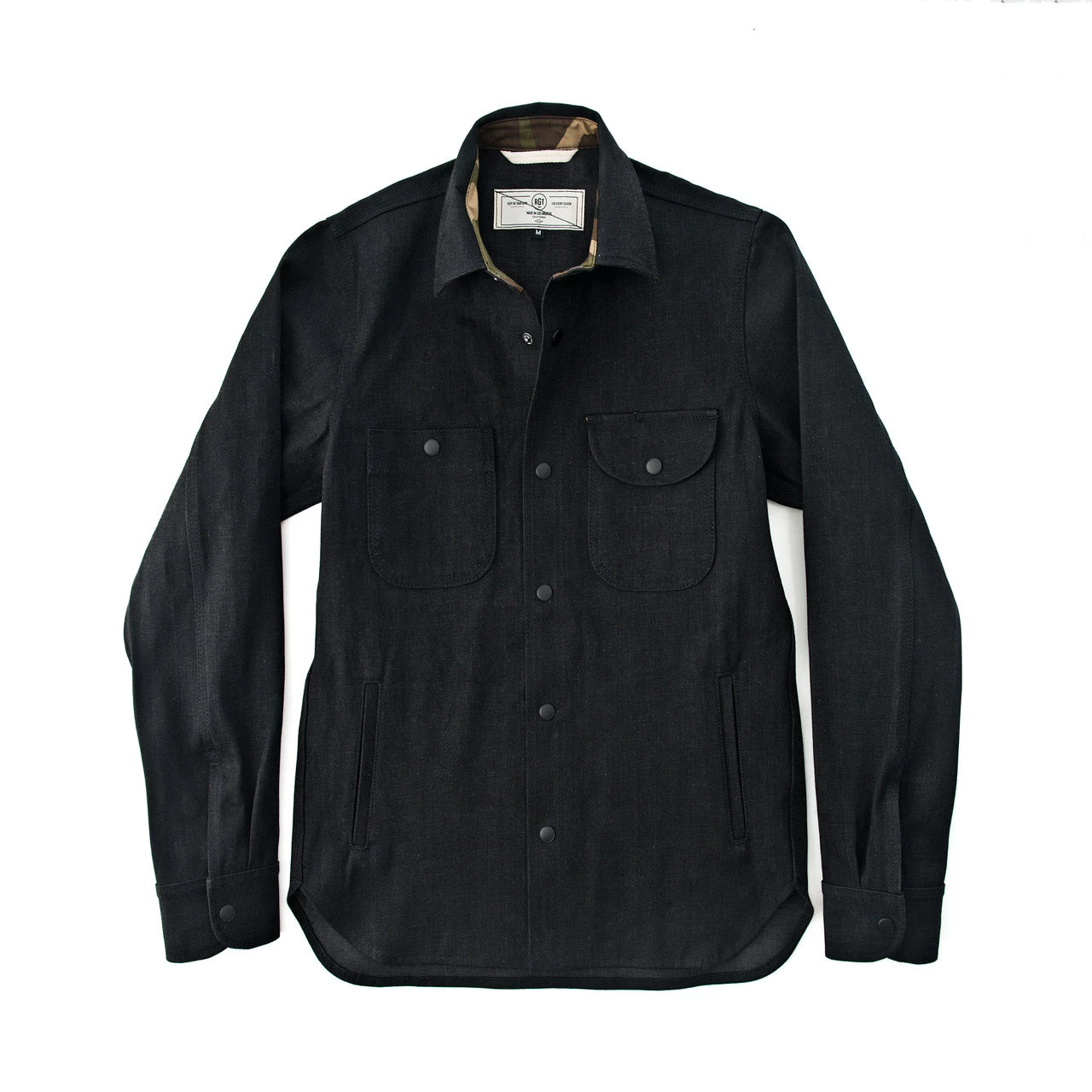 Handmade in downtown Los Angeles, this service shirt is ready to become the most versatile layer in your collection. It’s made of 15 oz proprietary black denim from Japan for a sturdy option that is perfect for fall, winter, and spring. Each shirt features handwarmer style welt pockets, two large chest pockets, triple-needle chain stitch seams with run-off detail, and matte black straps. It also includes a subtle dose of camo sateen on the collar stand and chest pocket flap to add to its stealthy look.