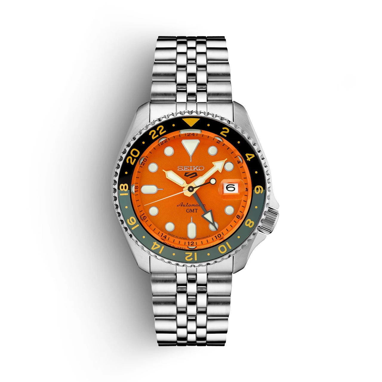 Just because a watch is seriously capable doesn’t mean it has to be boring. With a bright orange dial and matching numbers on the bezel, the SSK005 of Seiko’s 5 Sports GMT makes a bold statement. Inspired by the design of the SKX, it has a stainless steel case with a matching link bracelet and is powered by a Caliber 4R36 automatic movement that’s visible through the caseback. Luminous hands and markers, including an oversized GMT hand, help with readability, as does the magnifier above the 3 o’clock date window.