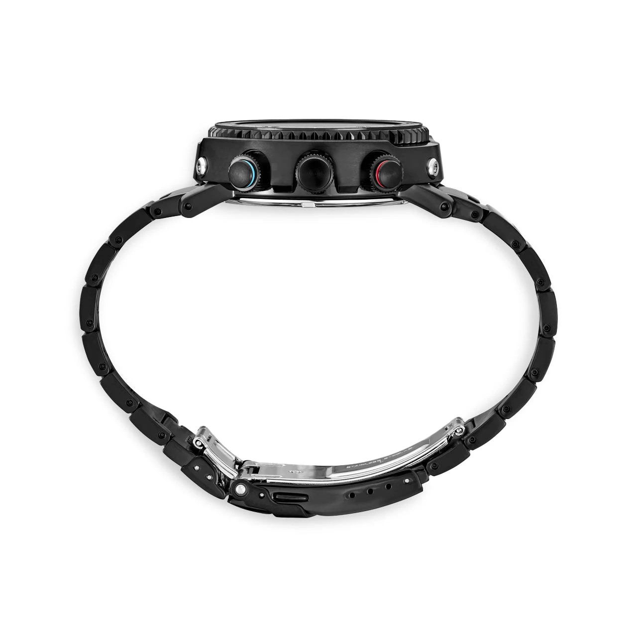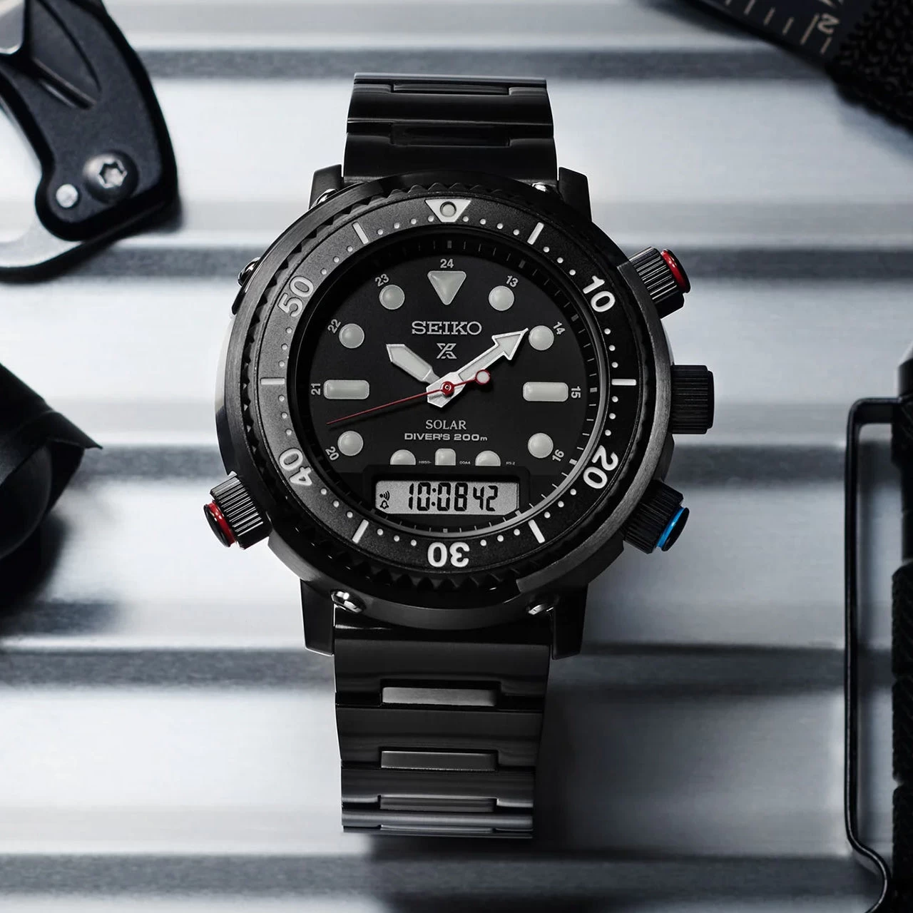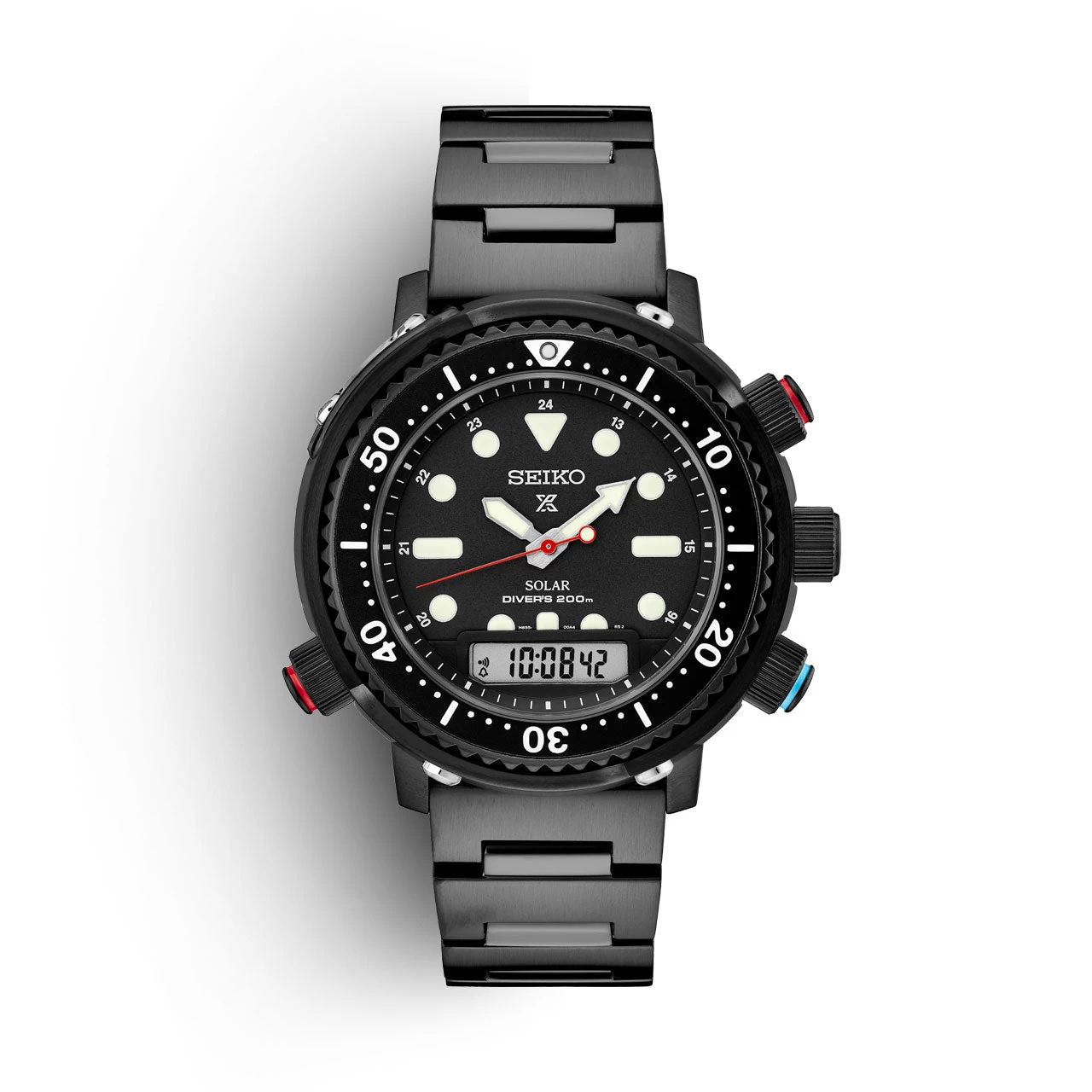 Released in 1982, the Seiko Hybrid Diver was the world’s first diving watch with an alarm and chronograph. The Prospex SNJ037 celebrates that model with a modern interpretation. It’s powered by a Caliber H855 solar quartz movement, which runs the three hands as well as a display at 6 o’clock. The latter is larger than on the original and serves as a diving log, depth meter, chronograph, alarm, and calendar. The rest of the black dial is occupied by LumiBrite indexes, with the lume also appearing on the hands and the unidirectional rotating bezel. Its chunky 46.9mm stainless steel case has a hard black coating, is water resistant to 200 meters, and sits on a matching bracelet with a three-fold clasp. The SNJ037 Hybrid Diver is limited to 4,000 examples, with its limited edition nature and serial number engraved on the caseback.