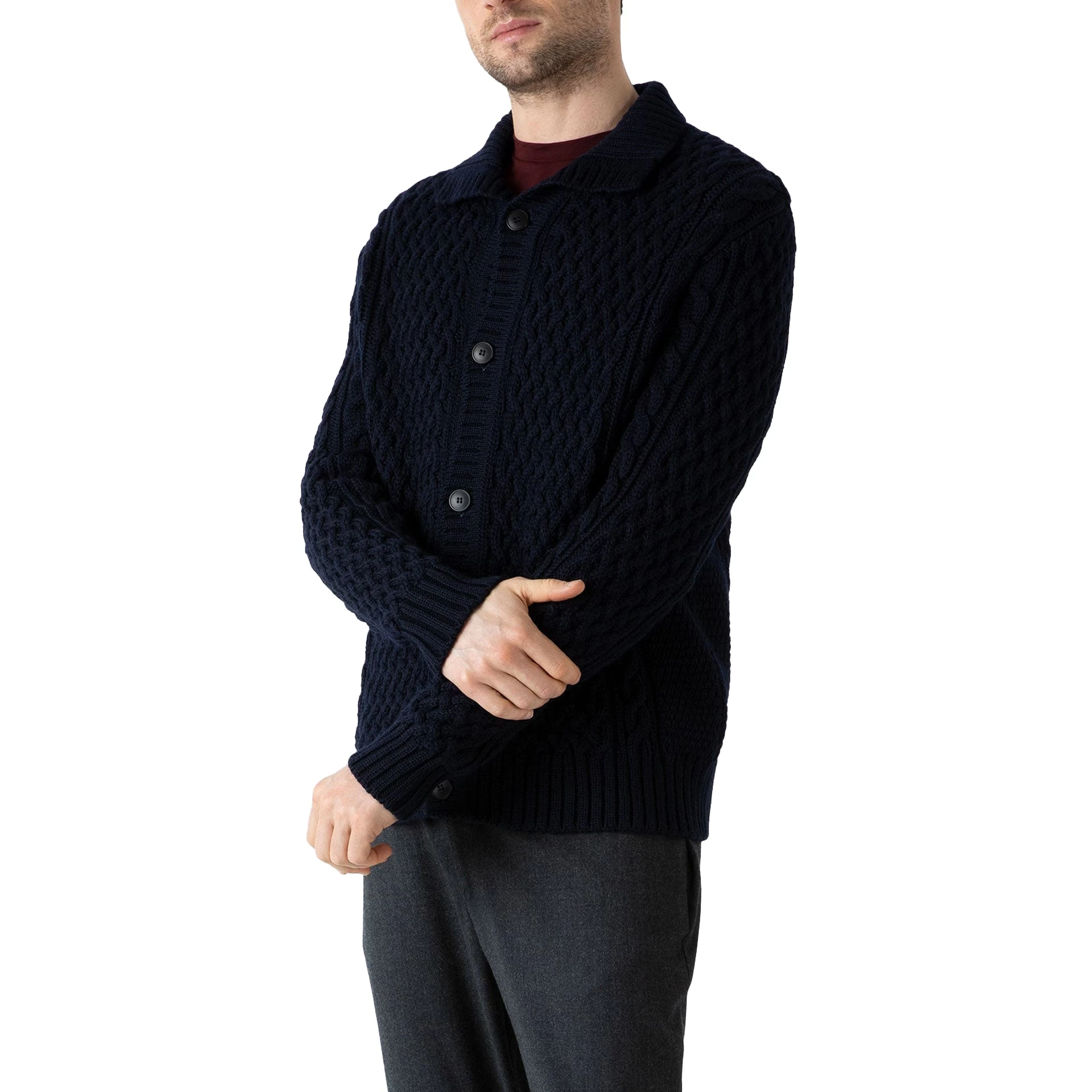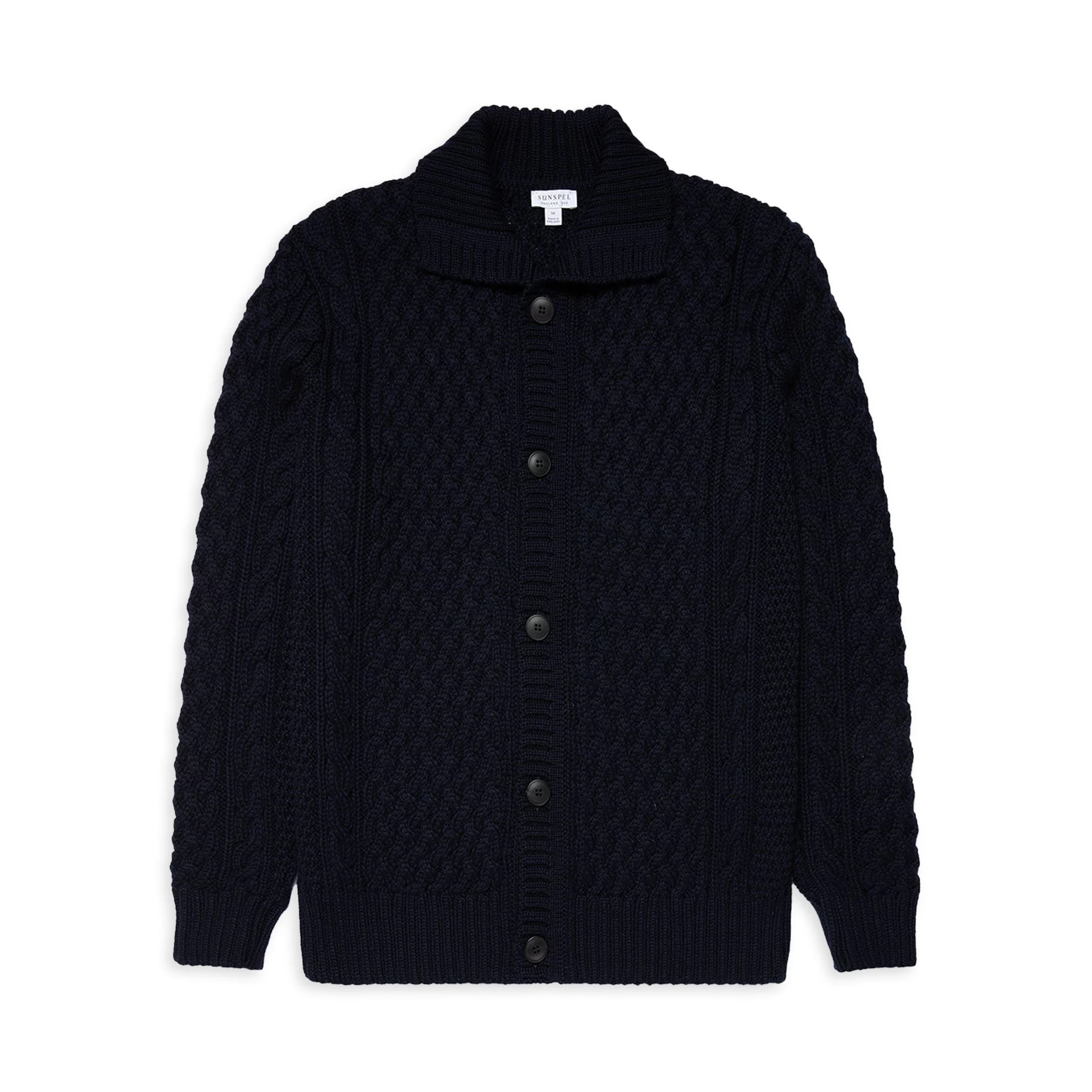 Since its founding in 1860, the Sunspel cardigan jacket has been a staple of the brand. This cable knit cardigan puts a modern twist on the classic, with a funnel neck collar, horn buttons, and an ultra-chunky cable knit stitch. Made in England from 100% Merino wool, it makes the perfect outer layer for the fall-to-winter transition.