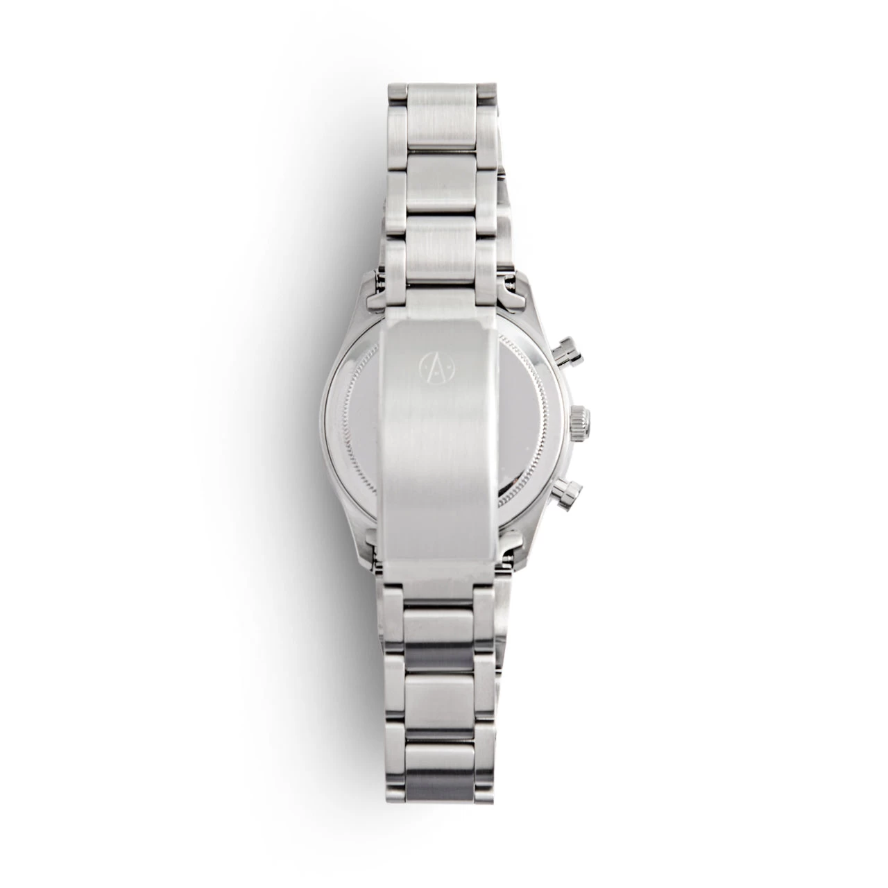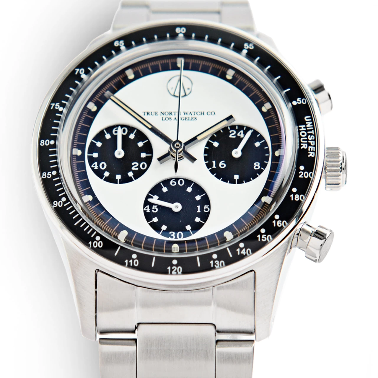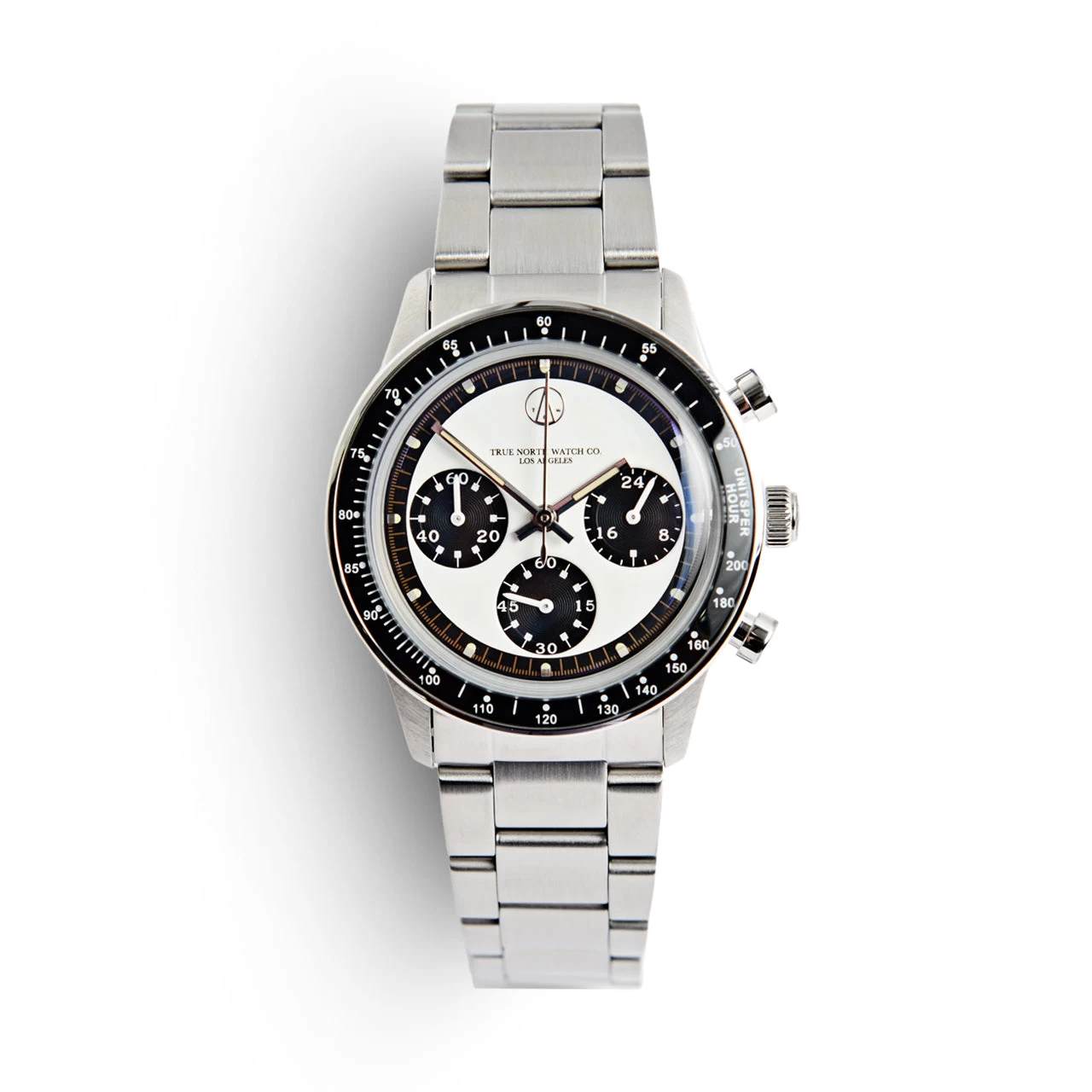Inspired by vintage Valjoux chronographs like the Daytona, True North’s VRT Legend sports a timeless design. It has a white panda dial with a silver index, black tachymeter bezel insert, and aged lume on the hour and minute hands. The stainless steel case holds a rugged meca-quartz movement that combines the accuracy of quartz with the feel and performance of a mechanical chronograph, and the watch sits on a stainless steel oyster bracelet. Hand-finished and assembled in Los Angeles.