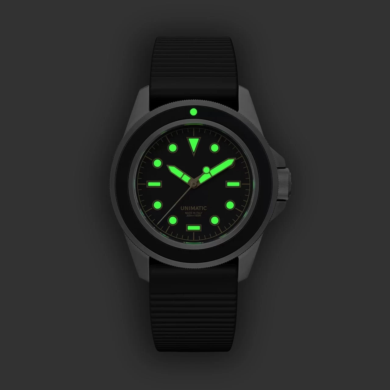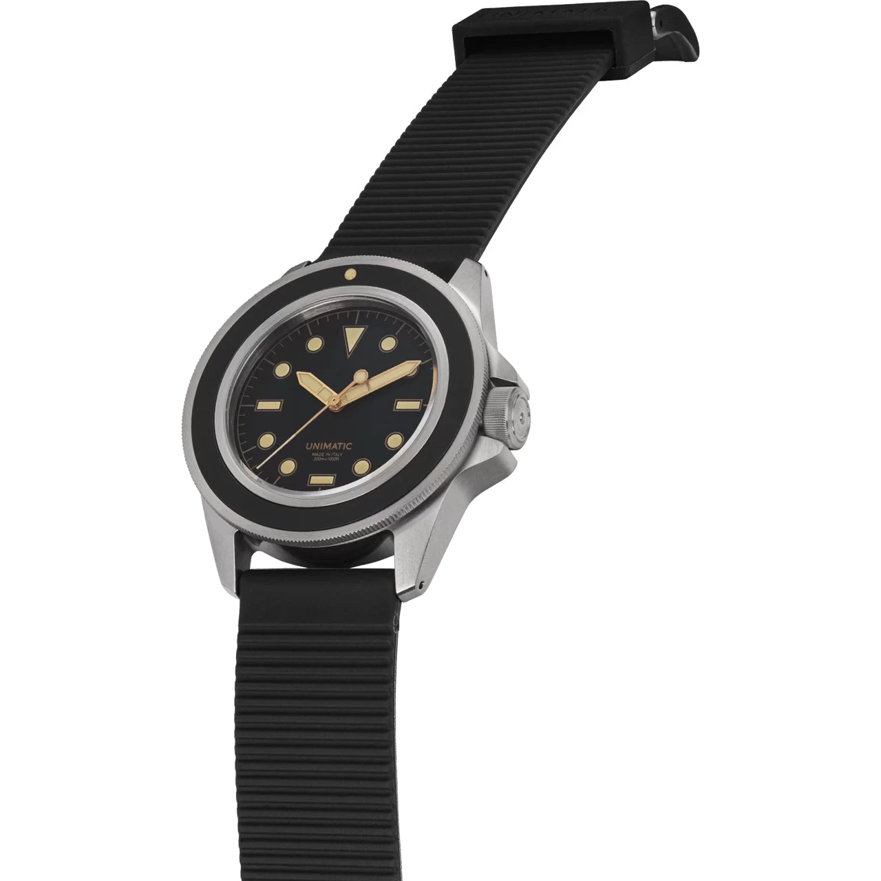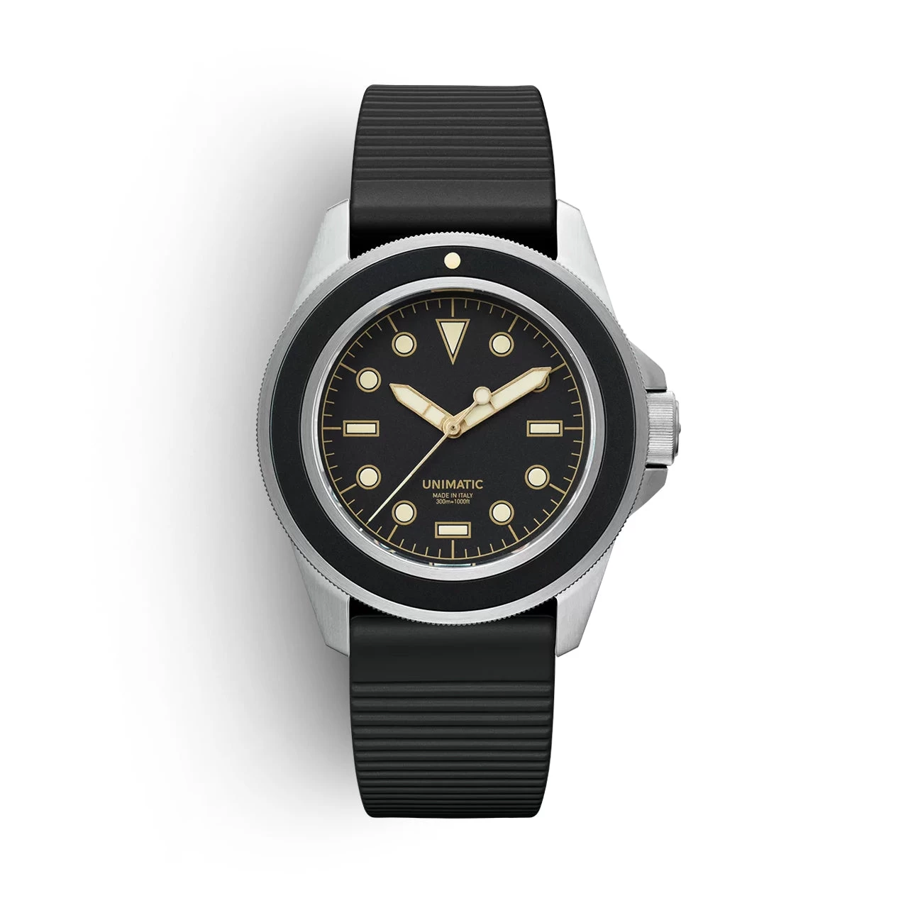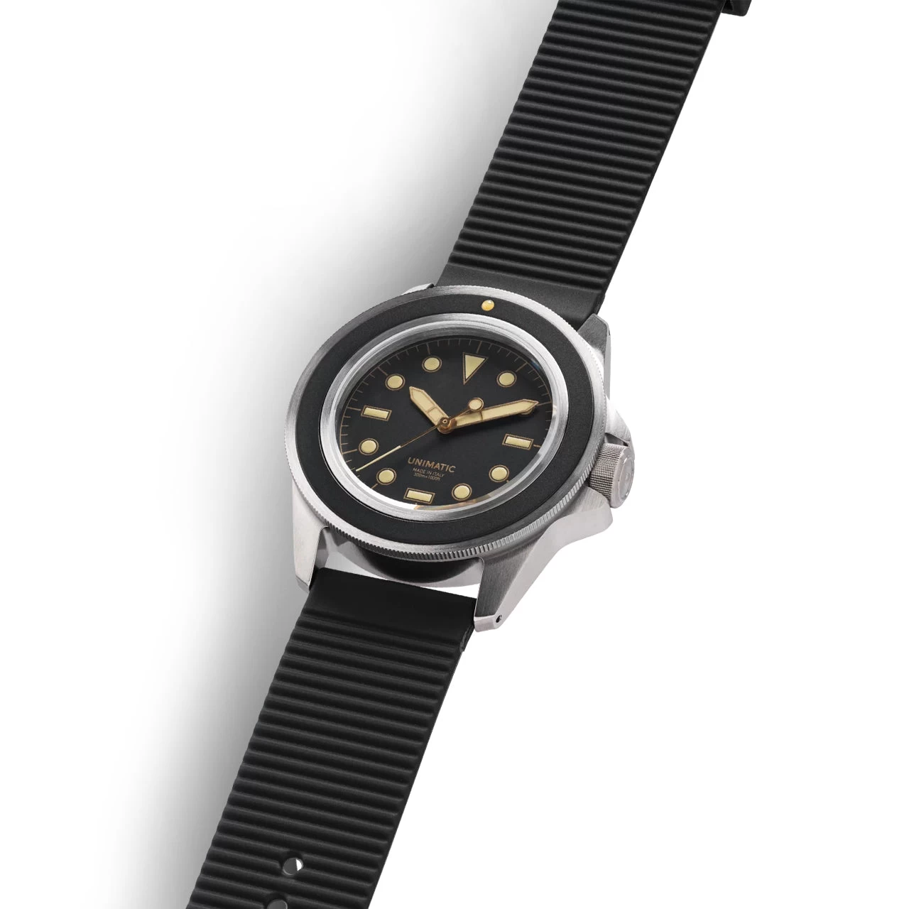 The Serie 8 U1S-8B embodies Unimatic’s minimalist ethos, combining a functional tool watch with a simplistic design that only emphasizes its usefulness. A black dial set in a brushed 316 stainless steel case is set with cream indices and gold accents on the minute track. The hands and indices are coated with Super-LumiNova C1 for easy legibility day or night. A unidirectional rotating bezel and water resistance down to 300m make the U1S-8B a capable diver’s watch. The automatic caliber Sellita SW200-1b movement features a hacking seconds hand and a 41-hour power reserve. A black rubber and NATO seatbelt strap are included, along with a Unimatic Tough case that can hold two watches.