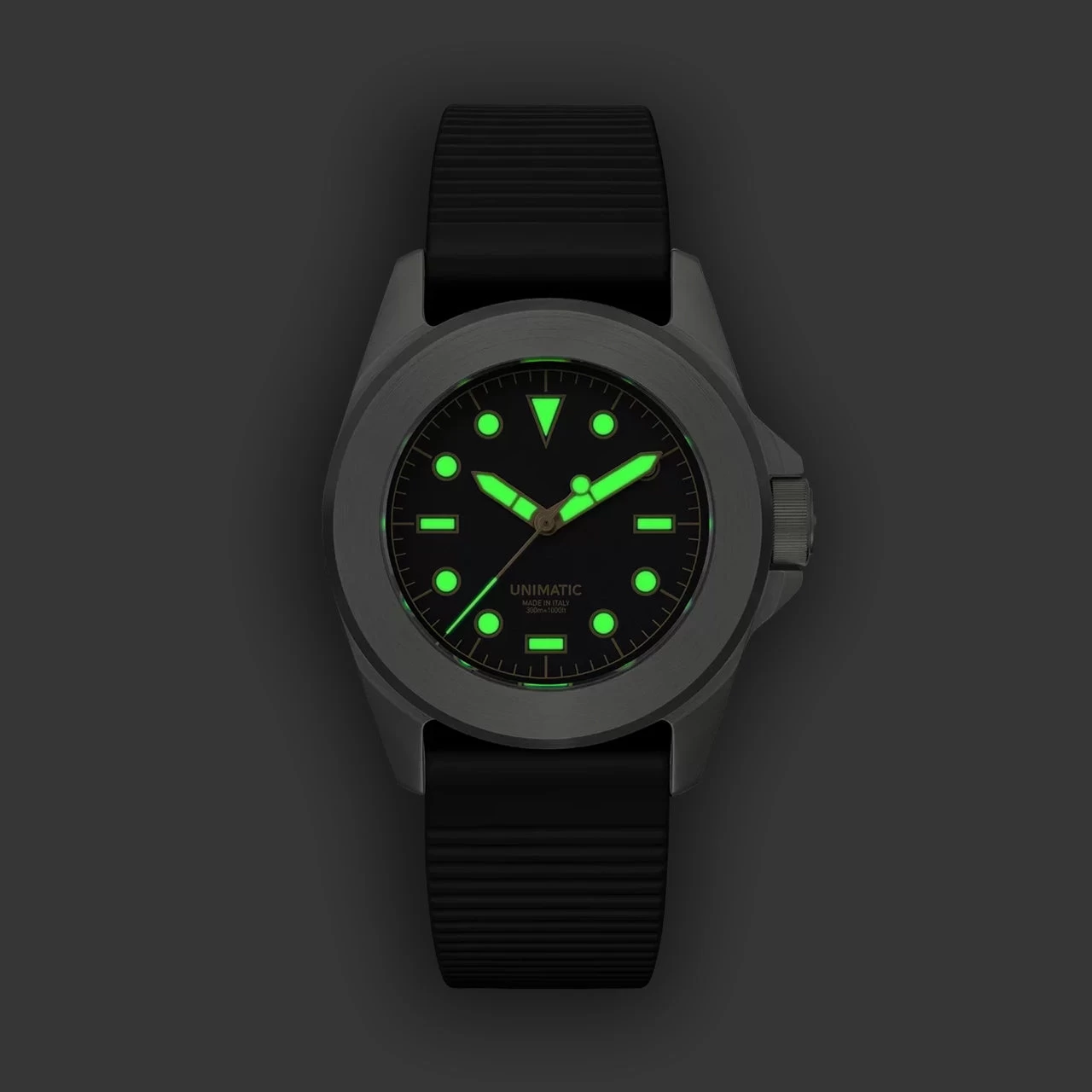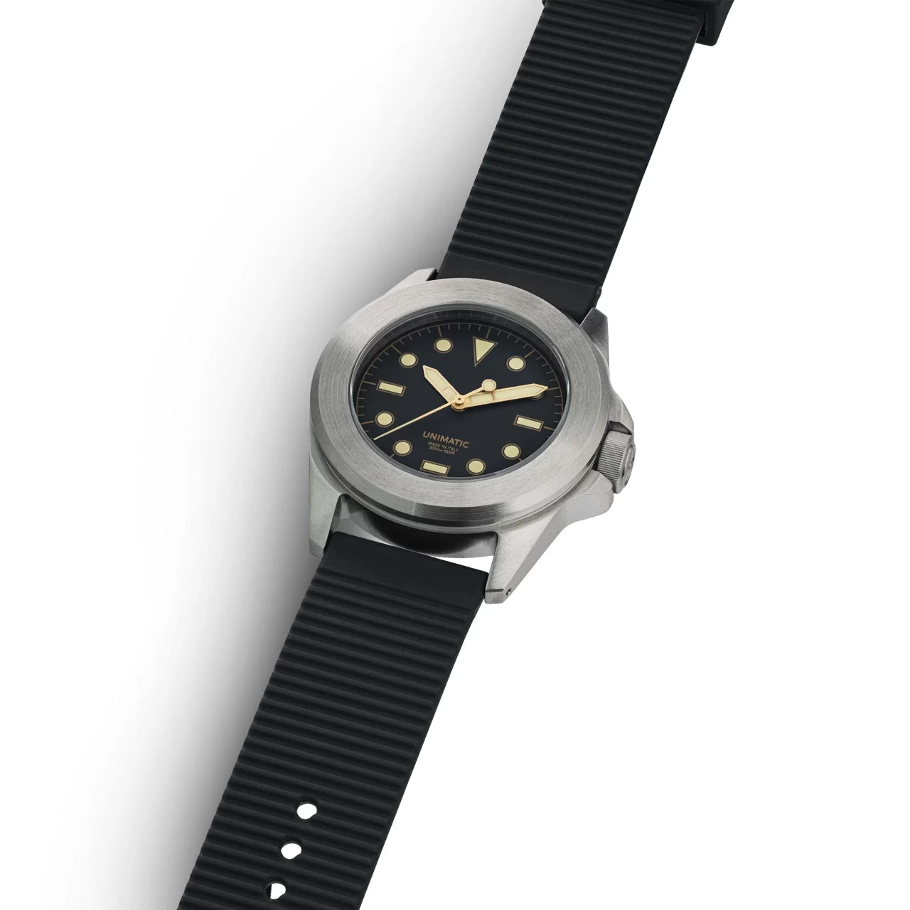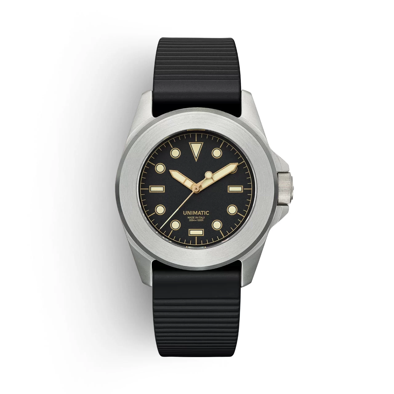 Unimatic’s minimalist design principles find their highest expression in the Serie 8 U4S-8B. The diver-inspired watch sports a black dial with cream indices and a minute track in burnished gold. While the 40mm stainless steel case doesn’t have the rotating bezel found on diver’s watches, the screw-down 8mm crown and back do offer water resistance of up to 300m. The Sellita SW200-1b movement incorporates a hacking seconds hand and provides a power reserve of 41 hours. A black strap, NATO seatbelt strap, and Unimatic Unimatic Tough case that can store two watches are included.