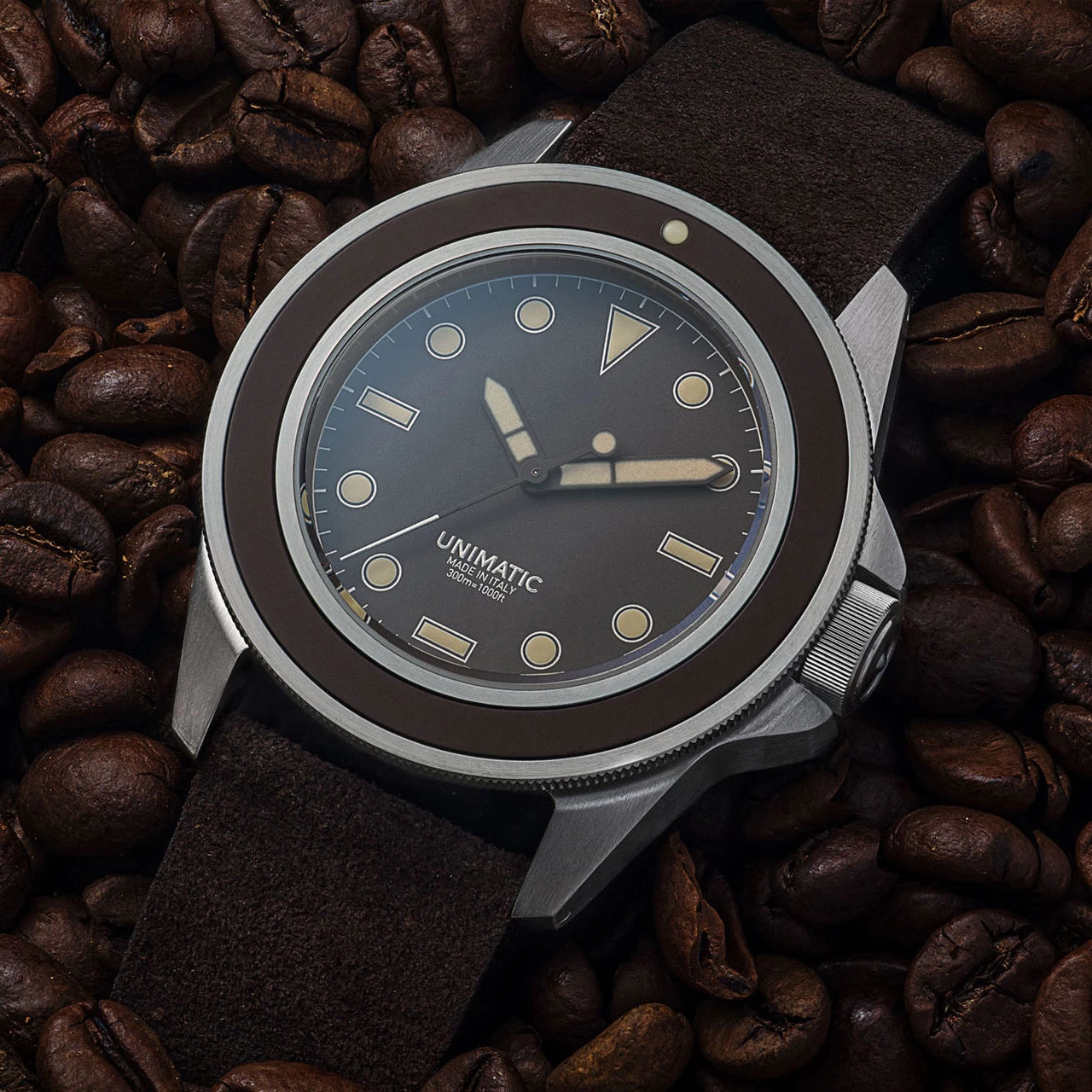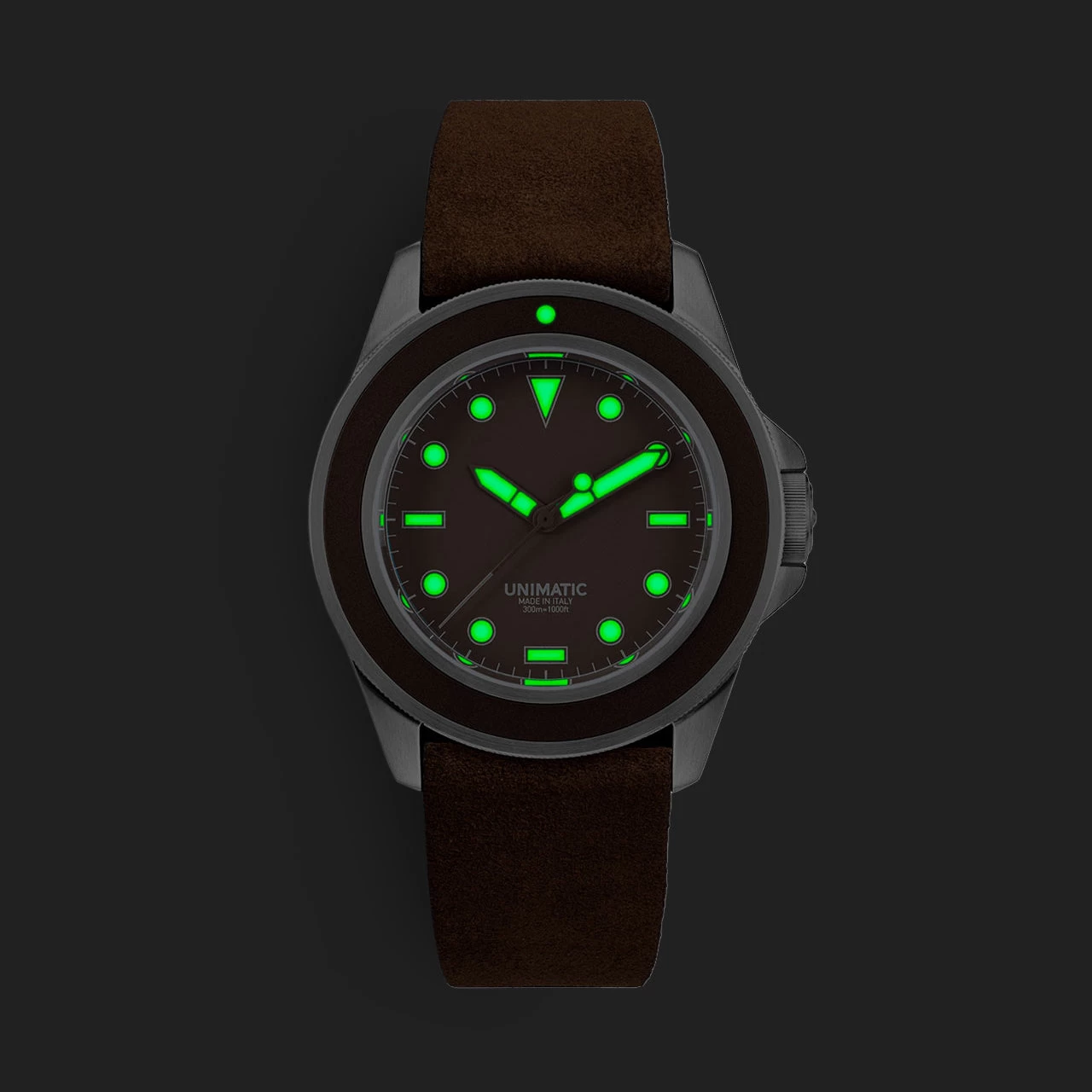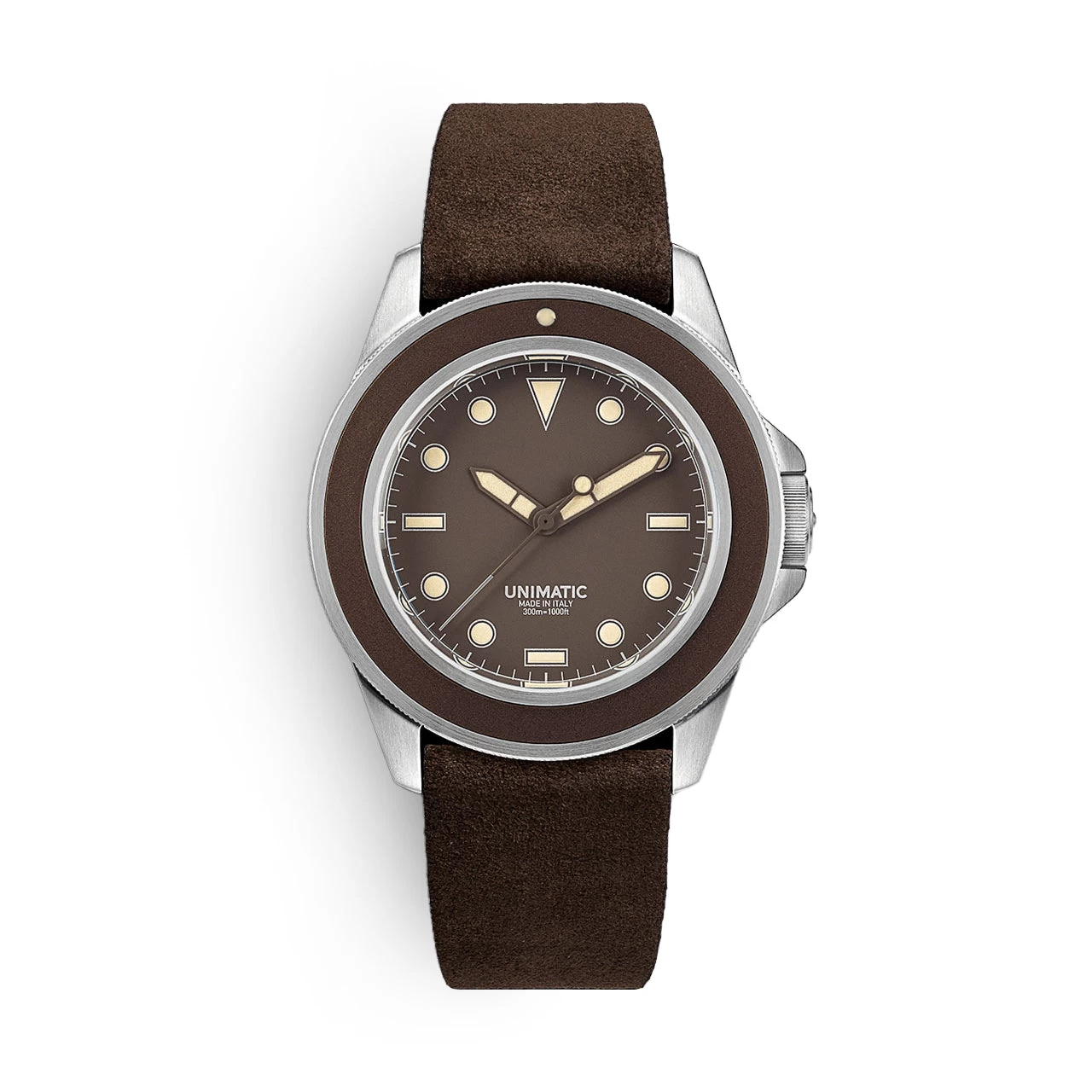 Slim yet rugged. Modern yet retro. The Unimatic U1s-MB is the best of both worlds. Its slim stainless steel case only gets slimmer by removing the mono-directional security bezel, which has a matte brown aluminum insert to match the matte brown dial. The indices are filled with Old Radium-colored Super-LumiNova with silver trims, giving the face a tropical feel, and are complemented by the brown suede two-piece strap. It’s powered by a Swiss-made automatic Sellita movement with a 38-hour power reserve and comes with a Unimatic tough case. Made in Italy and limited to 500 pieces.