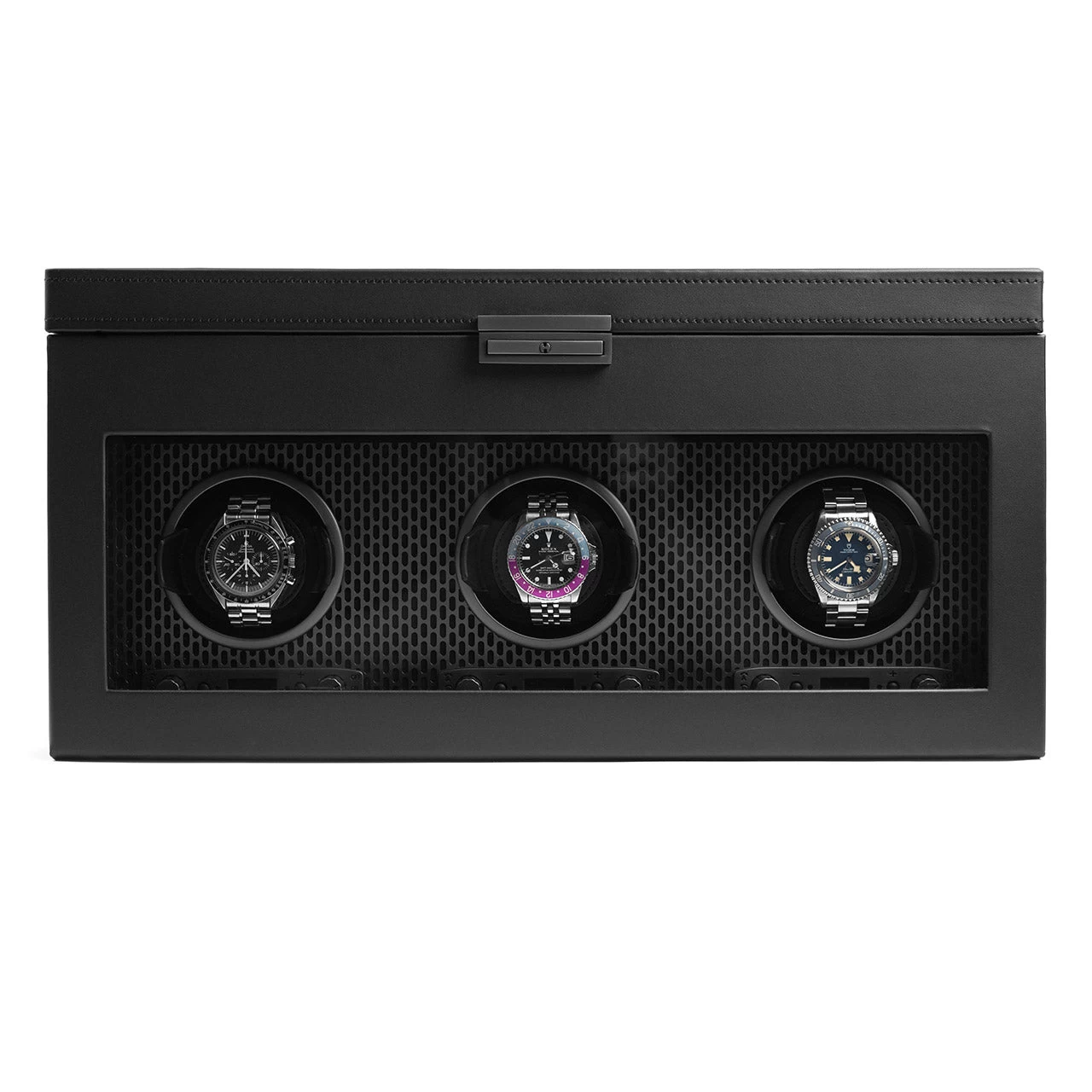 Purchasing a fine timepiece only to let it sit idle while not on your wrist is a mistake. It deserves the care and protection a proper watch winder provides. The Wolf Axis line of winders provides your collection of watches with a place of safekeeping of equal finish, craftsmanship, and technology as the timepieces it holds. A patented turn-counting mechanism can be set between 300 and 1200 turns per day, and bi-directional rotation programs give each timepiece in your collection the perfect wind while allowing you to view the status via the backlit LCD display. Its silent motor counts rotations precisely, while most other winders can only estimate, and can be run on AC power or lithium batteries. Doubling as a sleek display case with a custom black powder coat, microsuede interior, matte chrome finished hardware, and a locking glass cover, the Axis is available as a triple, double, or single winder, all of which include additional storage space with elevated cuffs that accommodate cases of up to 52mm. A universal adapter for the AC power is included for use in most international destinations.
