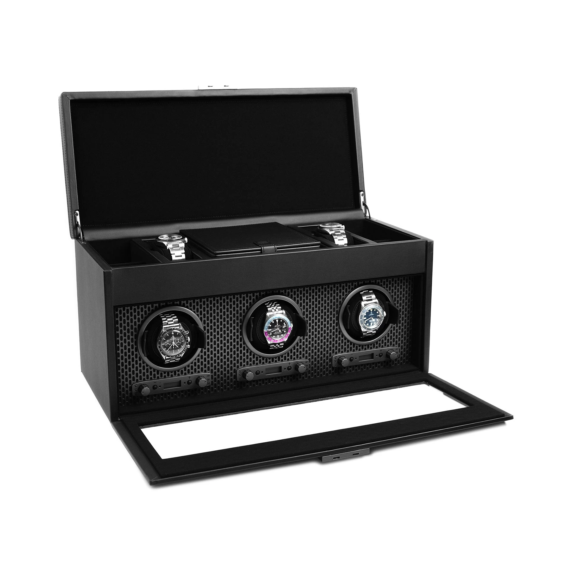 Triple Winder Storage: 4 medium compartments, two additional watch storage spaces with elevated cuff, travel case, and three winding modules. Dimensions: 18″ L x 8″ W x 9″ H