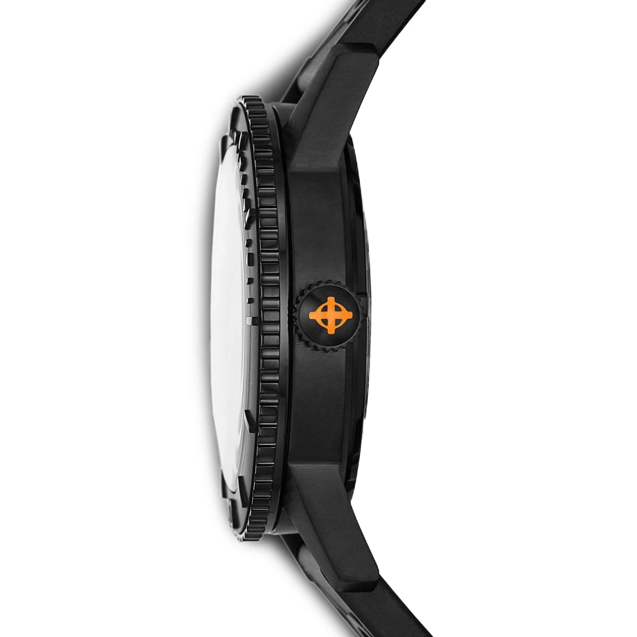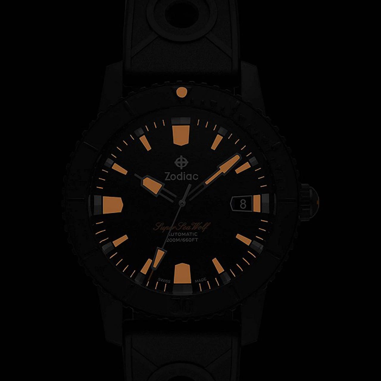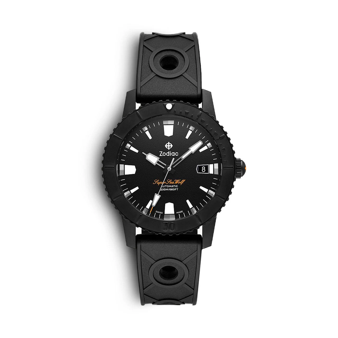 It has the same 660-foot water-resistance rating as the original Sea Wolf from 1953. But instead of traditional looks, this Super Sea Wolf 53 Compression has a modern blacked-out aesthetic. Its 40mm stainless case has been given a black DLC coating that pairs with the grainy black dial and lumed indexes, hands, and bezel to improve visibility underwater. It sits on a black rubber strap that helps add to its utilitarian vibe and is powered by an in-house STP 1-11 movement that runs the hour, minute, and second hands, as well as a date window that sits at 3 o’clock.