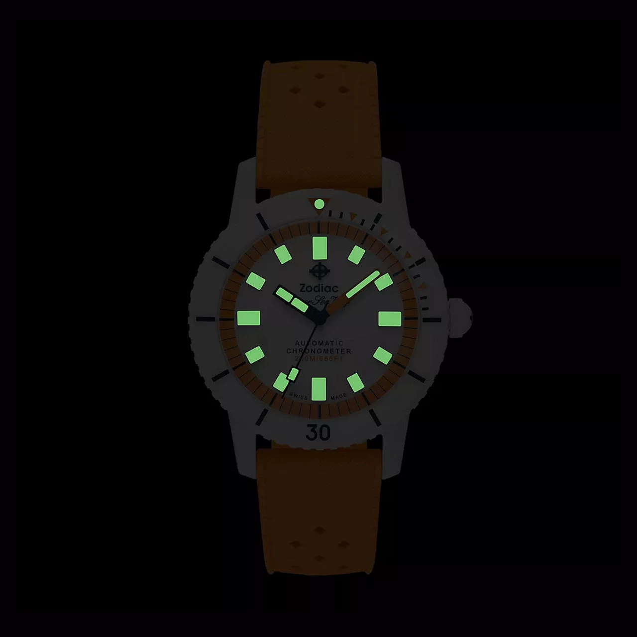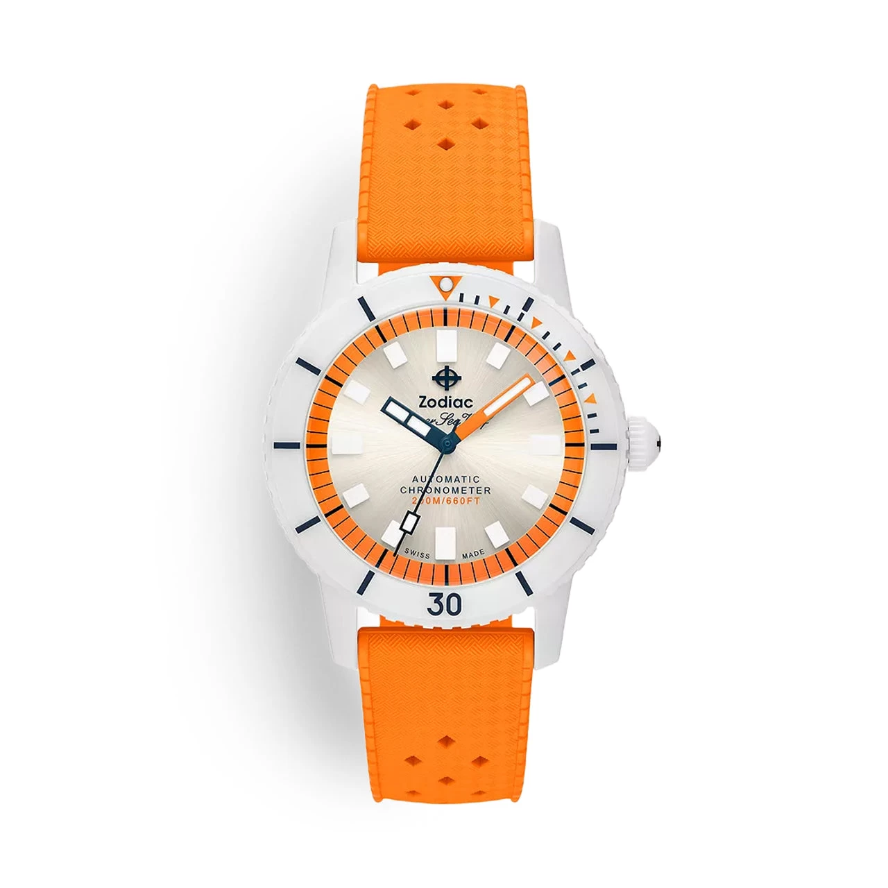 Resistant to scratching, corrosion, and fading, ceramic makes an ideal material for a diving watch. On Zodiac’s Super Sea Wolf Ceramic Compression, white ceramic is paired with a stainless steel core for added performance. The dial is a silvery, sunburst white, and is complemented by orange hands, timing ring, and accents on the white ceramic bezel. It’s powered by an automatic movement, employs Super-LumiNova on the hands and markers for readability when taking advantage of the 200m water resistance rating, and sits on a bold, comfortable rubber strap.