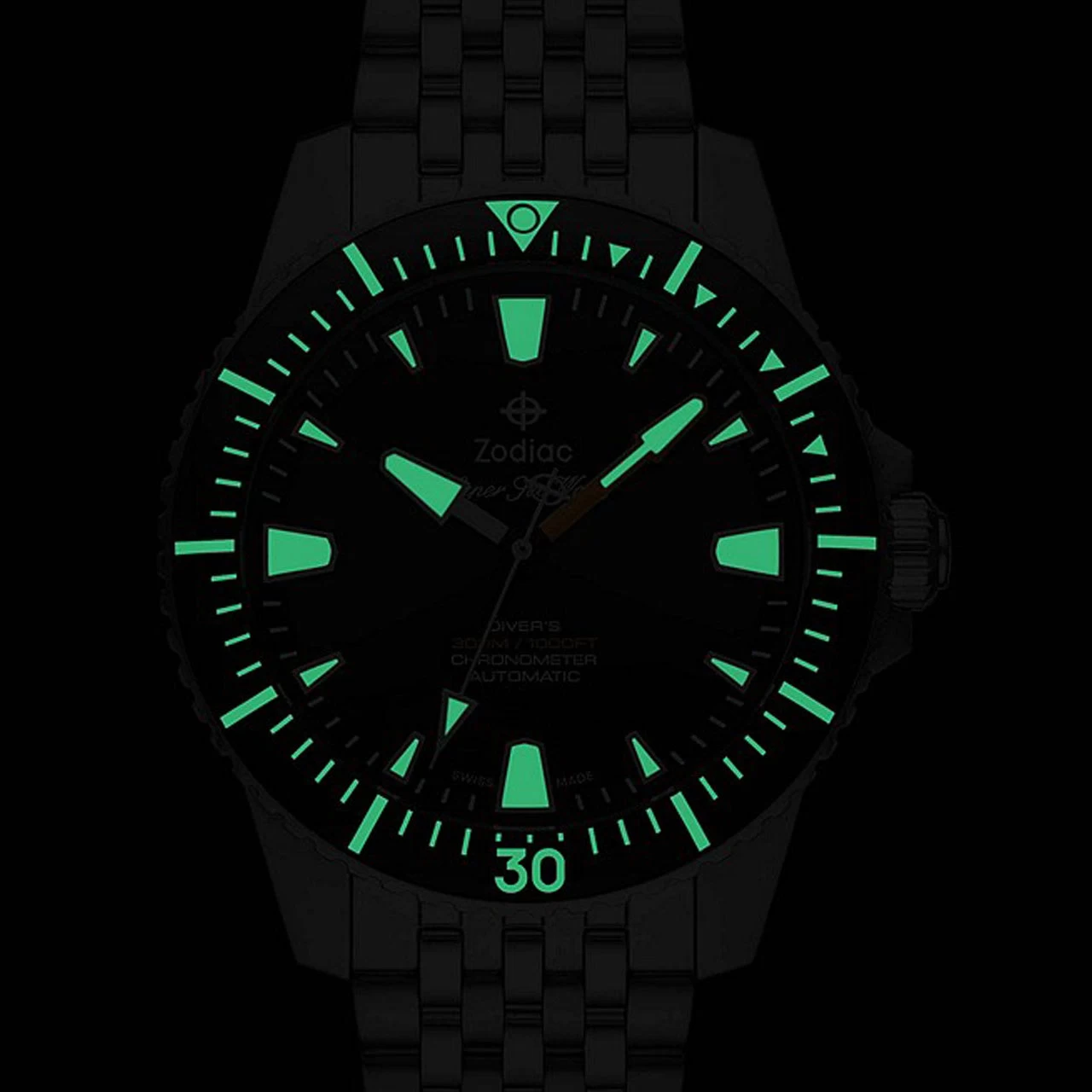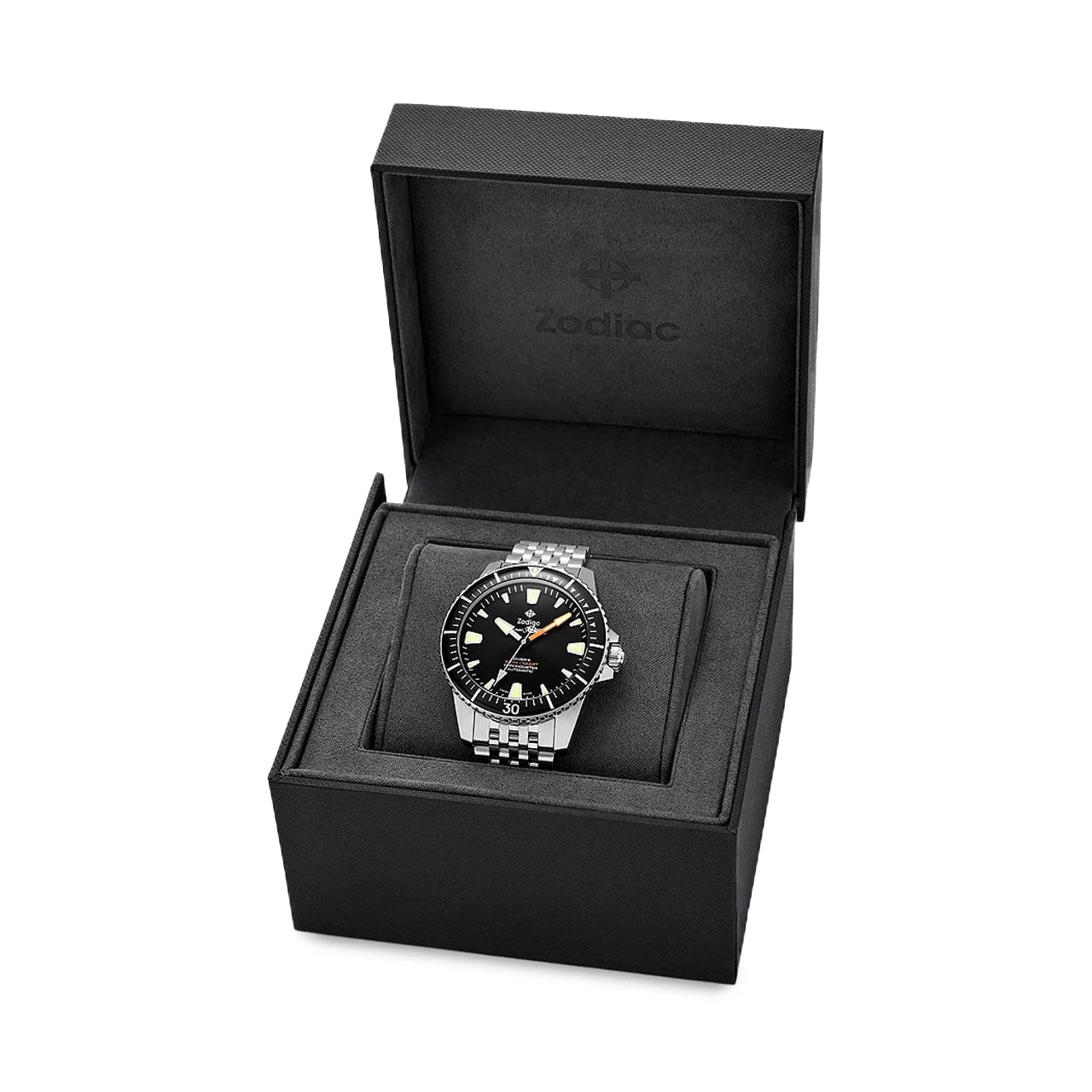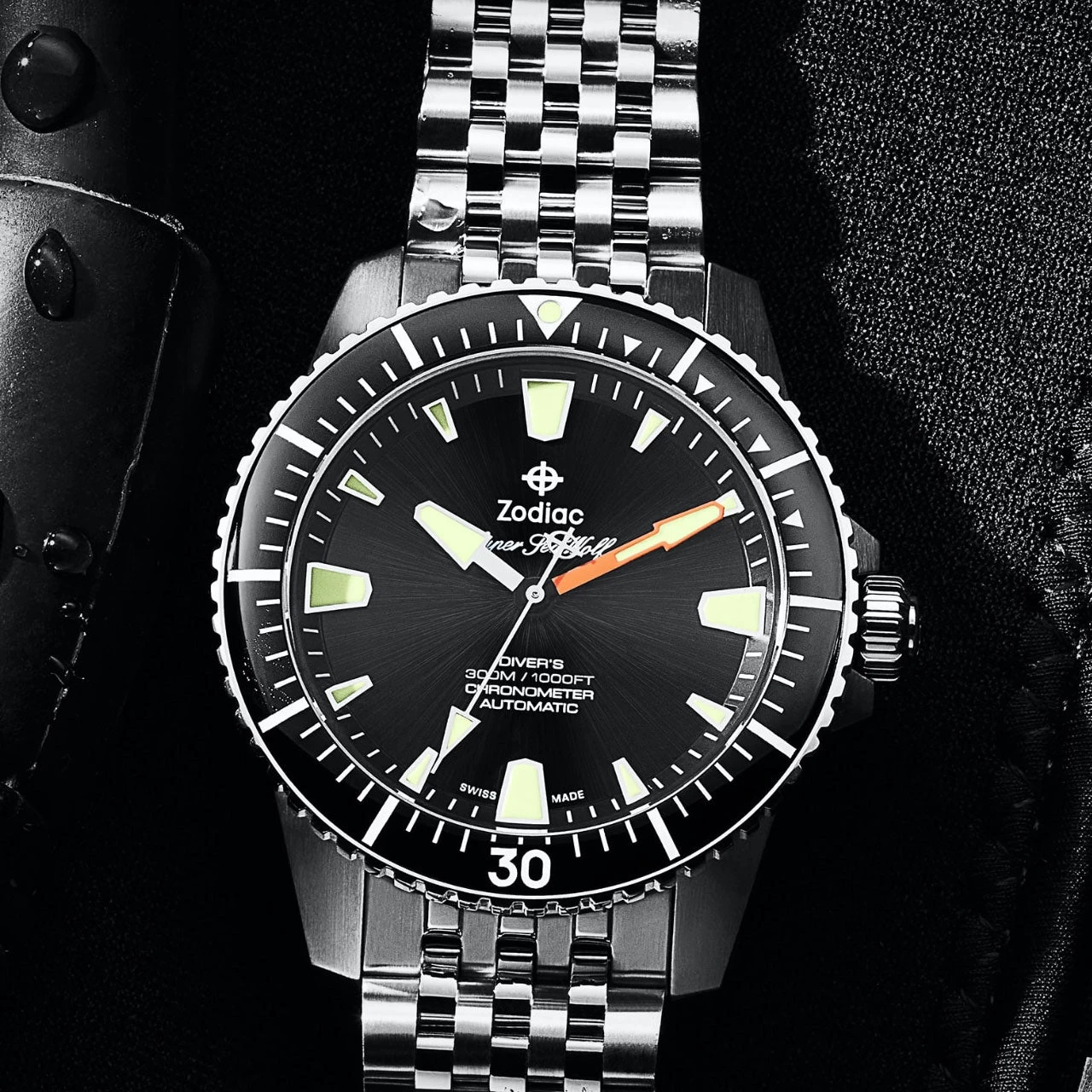 Zodiac’s original Sea Wolf launched in 1953. Water-resistant to over 600 feet, it was among the first dive watches and became a favorite of American soldiers and scuba enthusiasts alike. The brand has changed hands in the years since, but the Super Sea Wolf Pro-Diver carries on the spirit of the original. The “Diver” nomenclature indicates it’s got an ISO 6425 certification and offers 300M of water resistance, as well as diver-friendly features like boldy-lumed indices, hands, and dial-matching black bezel, and a robust 42mm stainless steel body. It sits on a matching 7-link stainless steel bracelet and is powered by a Swiss-made, COS-C Certified Sellita SW200-1 automatic movement. Hand-assembled in Biel-Bienne, Switzerland.